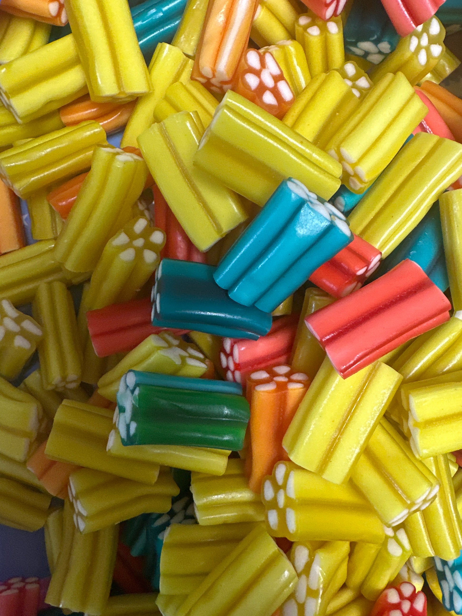 Zutaten: Zucker, Glukose-Fruktose-Sirup, Weizenmehl (Gluten), Reisstärke, modifizierte Mais- und Kartoffelstärke, ganz gehärtete Pflanzenfette (Palmkern, Kokosnuss), Feuchthaltemittel (Glycerin), Emulgator (Mono- und Diglyceriden von Fettsäuren), Verdickungsmittel (Gummi Arabicum), Farbstoff (Karminrot), Aroma, Säuerungsmittel (Zitronensäure, Apfelsäure), Salz, Pflanzenöl (Kokosnuss, Raps), Uberzugsmittel (Carnaubawachs). Fondantfüllung 60%.