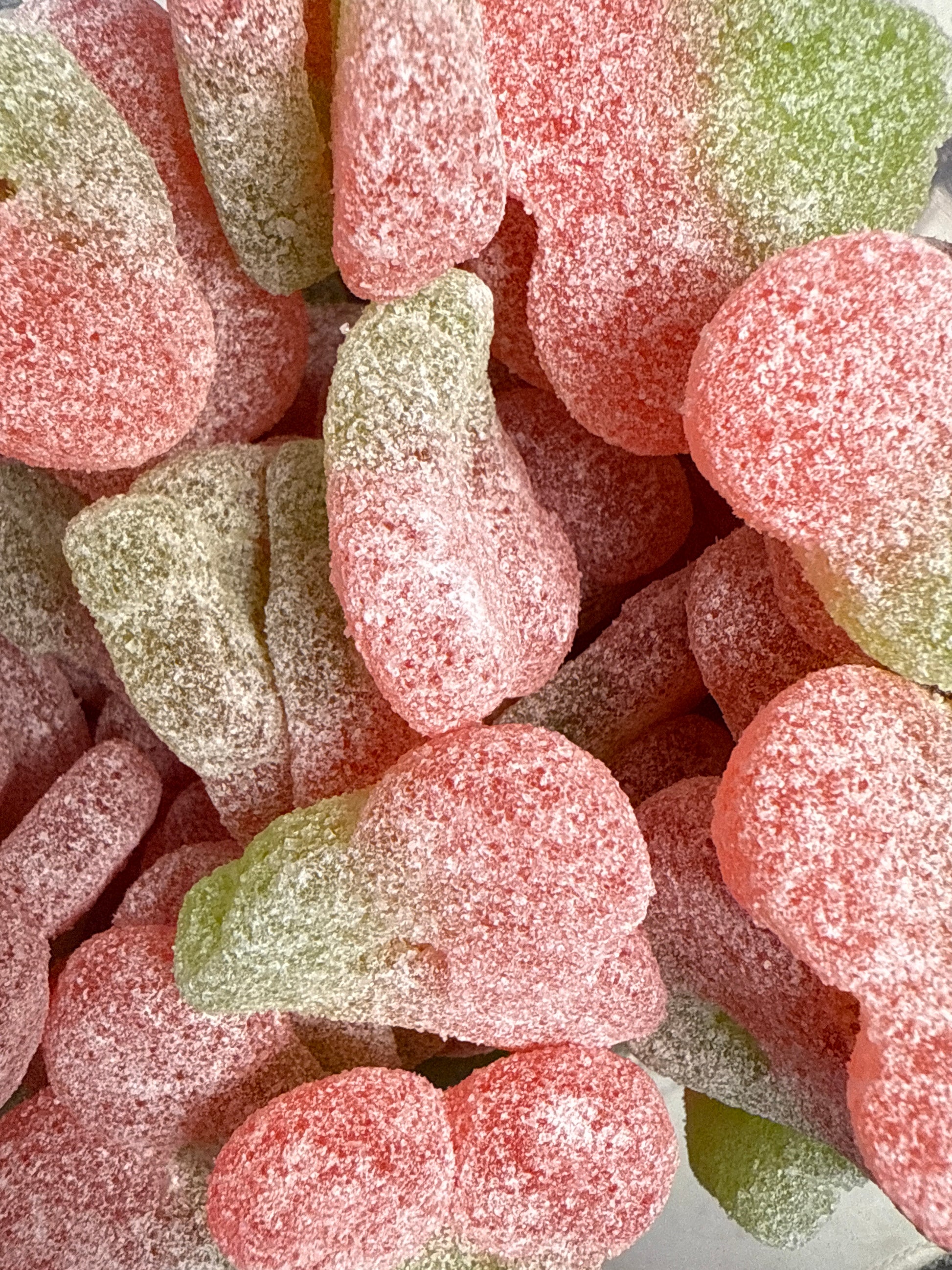 Zutaten: Zucker, Glukosesirup, Wasser, Gelatine, Säuerungsmittel (E330, E334), Aromen (Kirsche), Farbstoffe (E120, E133, E161b).
